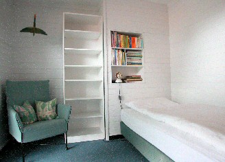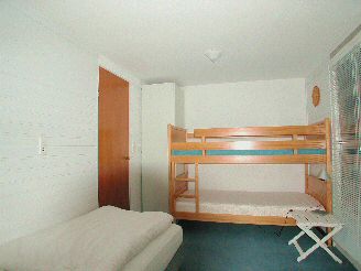 Im Obergeschoss befinden sich zwei Schlafzimmer: zum einen das Elternschlafzimmer mit dem typischen Doppelbett, zum anderen ein Dreibettzimmer mit einem französischen Polsterbett und einem Doppelstockbett. Dieses Zimmer verfügt über einen Balkon zur Süd-West ausgerichteten Terrassenseite. Das vorhandene Babybett kann nur in diesem Zimmer aufgestellt werden. Das Obergeschoss kann mit einem Kinderpförtchen zur Treppe hin gesichert werden. |